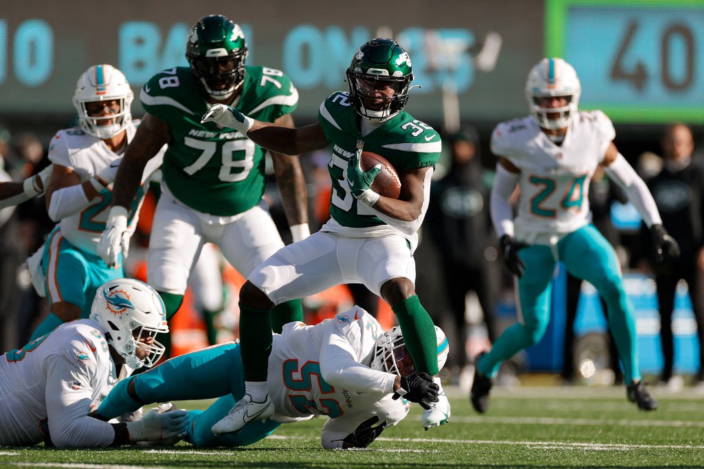 EAST RUTHERFORD, NEW JERSEY – NOVEMBER 21: Michael Carter #32 of the New York Jets carries the ball as Miami Dolphins players defend in the first half of the game at MetLife Stadium on November 21, 2021 in East Rutherford, New Jersey. Sarah Stier/Getty Images/AFP (Photo by Sarah Stier / GETTY IMAGES NORTH AMERICA / Getty Images via AFP)