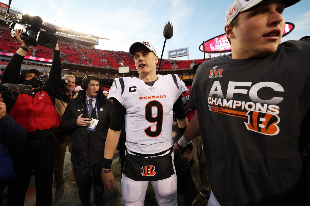 KANSAS CITY, MISSOURI – JANUARY 30: Quarterback Joe Burrow #9 of the Cincinnati Bengals celebrates the Bengals overtime win against the Kansas City Chiefs in the AFC Championship Game at Arrowhead Stadium on January 30, 2026 in Kansas City, Missouri. Jamie Squire/Getty Images/AFP (Photo by JAMIE SQUIRE / GETTY IMAGES NORTH AMERICA / Getty Images via AFP)