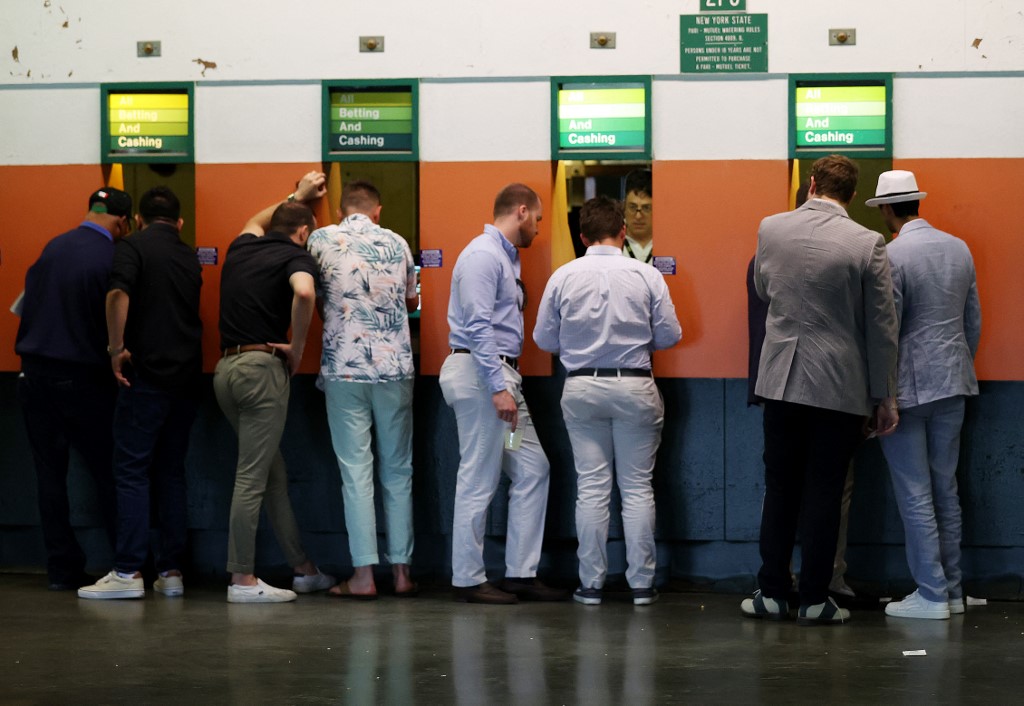 ELMONT, NEW YORK – JUNE 11: Fans line up at the betting window during the 154th running of the Belmont Stakes at Belmont Park on June 11, 2026 in Elmont, New York. Al Bello/Getty Images/AFP