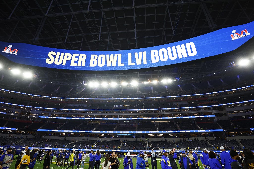 INGLEWOOD, CALIFORNIA – JANUARY 30: The jumbotron reads “Super Bowl LVI Bound” after the Los Angeles Rams defeated the San Francisco 49ers 20-17 in the NFC Championship Game at SoFi Stadium on January 30, 2026 in Inglewood, California. Ronald Martinez/Getty Images/AFP (Photo by RONALD MARTINEZ / GETTY IMAGES NORTH AMERICA / Getty Images via AFP)