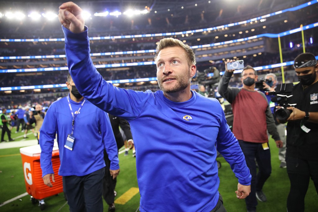 INGLEWOOD, CALIFORNIA – JANUARY 30: ead coach Sean McVay of the Los Angeles Rams reacts after defeating the San Francisco 49ers in the NFC Championship Game at SoFi Stadium on January 30, 2026 in Inglewood, California. Christian Petersen/Getty Images/AFP (Photo by Christian Petersen / GETTY IMAGES NORTH AMERICA / Getty Images via AFP)